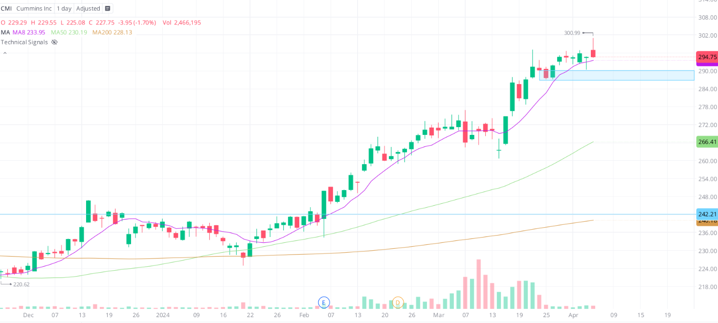 - Rejection of a New High: Although CMI recently rejected a new high, this action should not deter investors. Instead, it suggests that the price is correcting itself, offering a more favorable entry point.