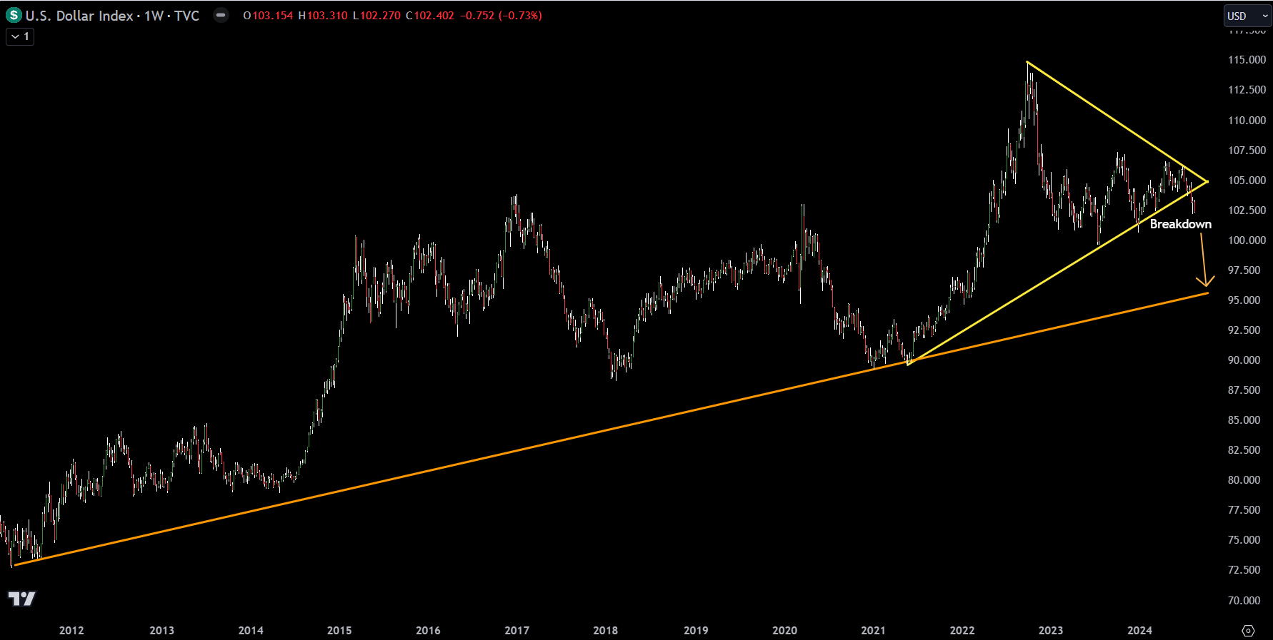 As shown in the attached chart, the DXY has broken down from a long-term ascending triangle pattern that has been forming since 2021.