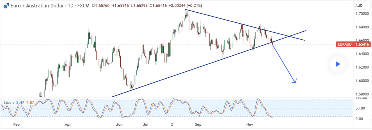 The EURAUD pair's recent uptrend signals a potential market shift, highlighted by a 1D triangle pattern. As the pattern suggests a reversal, a successful trade execution has confirmed the emergence of a bearish movement.