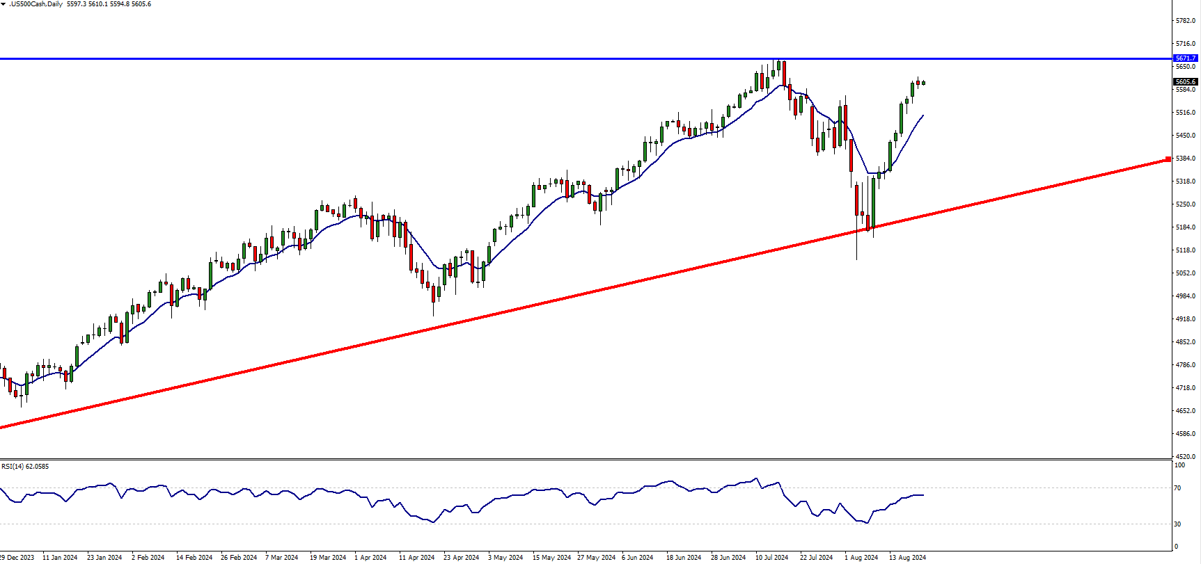The S&P 500 is currently bullish, with potential to test the resistance level at 5671.7. However, traders should be cautious as the price nears this key resistance and monitor the RSI for any signs of weakening momentum.